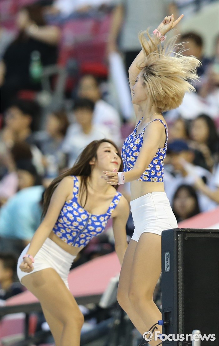 (서울=포커스뉴스) 6일 서울 잠실구장에서 열린 2016 프로야구 넥센-두산 경기에서 두산 치어리더가 비온 후의 선선한 여름밤에 열기를 더 하고 있다.