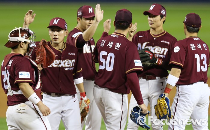 (서울=포커스뉴스) 6일 서울 잠실구장에서 열린 2016 프로야구 넥센-두산 경기에서 두산을 물리치고 6연승한 넥센 선수들이 마운드에 모여 하이파이브하고 있다.