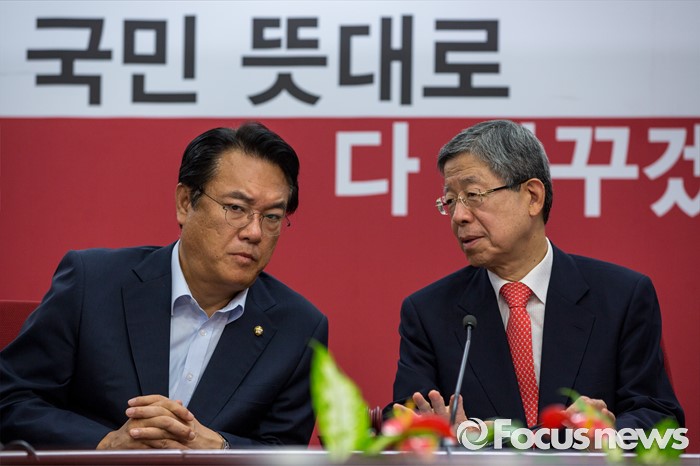 (서울=포커스뉴스) 김희옥(오른쪽) 새누리당 혁신비상대책위원장과 정진석 원내대표가 7일 오전 서울 여의도 새누리당사에서 열린 혁신비상대책위원회의에 참석해 대화 하고 있다.