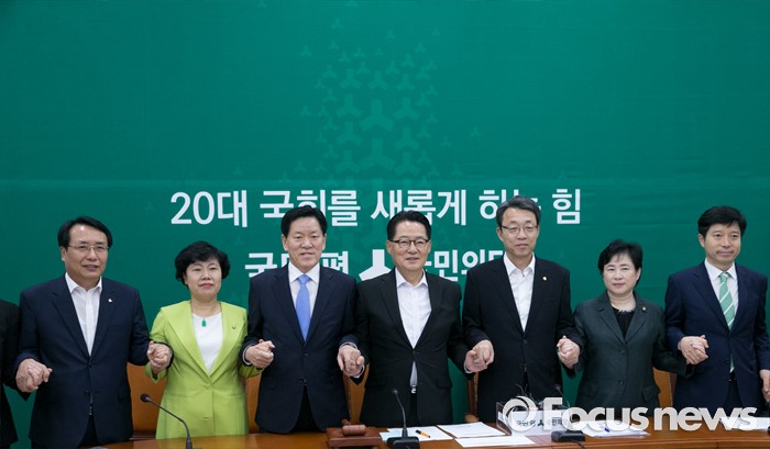 (서울=포커스뉴스) 7일 오전 서울 여의도 국회에서 열린 국민의당 첫 비상대책위원회의에 참석한 박지원(왼쪽 네번째) 비대위원장과 비대위원들이 손을 잡고 취재진을 향해 포즈를 취하고 있다.