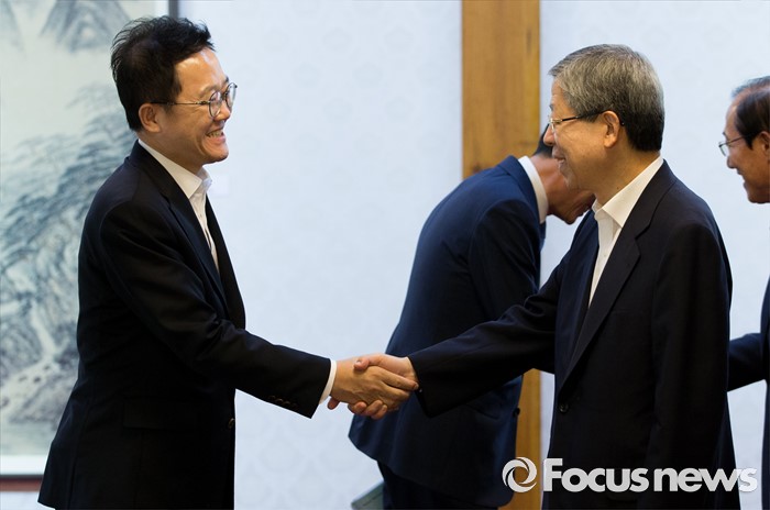 (서울=포커스뉴스) 7일 오후 서울 종로구 삼청동 국무총리공관에서 열린 당·정·청 정책조정협의회에서 김희옥(오른쪽) 새누리당 혁신비상대책위원장이 강석훈 청와대 경제수석과 인사를 나누고 있다.
