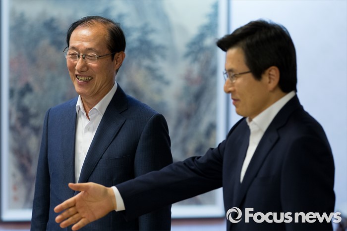 (서울=포커스뉴스) 7일 오후 서울 종로구 삼청동 국무총리공관에서 열린 당·정·청 정책조정협의회에서 황교안(오른쪽) 국무총리가 이원종 대통령 비서실장에게 자리를 안내하고 있다.