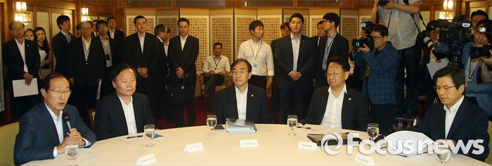 (서울=포커스뉴스) 7일 오후 서울 종로구 삼청동 국무총리공관에서 열린 당·정·청 정책조정협의회에서 이원종(왼쪽) 대통령 비서실장이 모두발언을 하고 있다.
