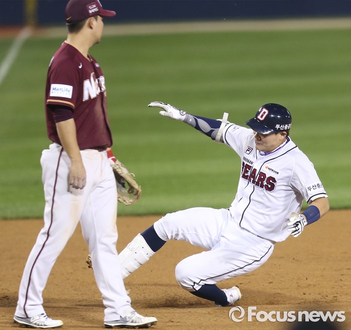 (서울=포커스뉴스) 6일 서울 잠실구장에서 열린 2016 프로야구 넥센-두산 경기 7회말 두산 선두타자 박세혁이 우익수 오른쪽으로 떨어지는 3루타를 치고 3루에서 슬라이딩하고 있다.