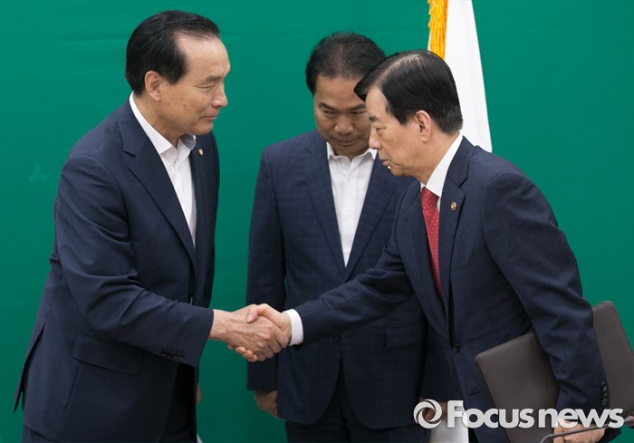 (서울=포커스뉴스) 한민구(오른쪽) 국방부 장관이 8일 오전 서울 여의도 국회를 방문해 사드배치 등과 관련 면담에 앞서 김중로(왼쪽) 국민의당 국방위 간사와 인사하고 있다.