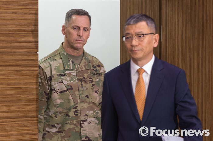(서울=포커스뉴스) 8일 오전 서울 용산구 국방부 브리핑실에서 류제승 국방부 국방정책실장(오른쪽)과 토머스 벤달 주한미군 8군 사령관(왼쪽)이 주한미군 사드(THAAD) 배치 결정과 주한민국의 사드 배치 가능성에 대한 공식협의 개시를 발표하기 위해 브리핑실로 들어서고 있다.