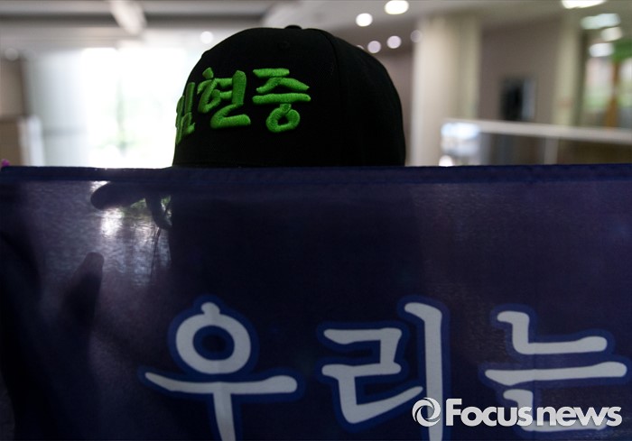(서울=포커스뉴스) 8일 오후 서울중앙지방법원에서 전 여자친구와 민사소송 중인 가수 김현중의 홍콩, 일본, 중국 팬들이 김현중을 응원하는 손피켓을 들고 있다.