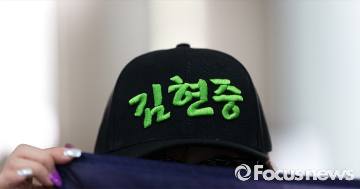 (서울=포커스뉴스) 8일 오후 서울중앙지방법원에서 전 여자친구와 민사소송 중인 가수 김현중의 홍콩, 일본, 중국 팬들이 김현중을 응원하는 손피켓을 들고 있다.