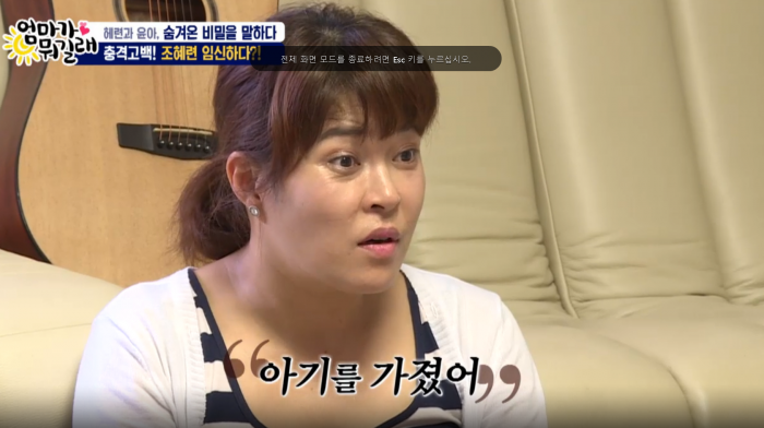 7일 방송된 TV조선 '엄마가 뭐길래'에서 조혜련은 가족들 앞에서 "할말이 있다. 재혼하고 나서 우리 아이들하고 정말 잘 지내고 있었는데 사실 중간에 아기를 가졌다"며 "47살에 아기를 가진다는 게 사실 쉽지 않은 일이다"라고 고백했다.