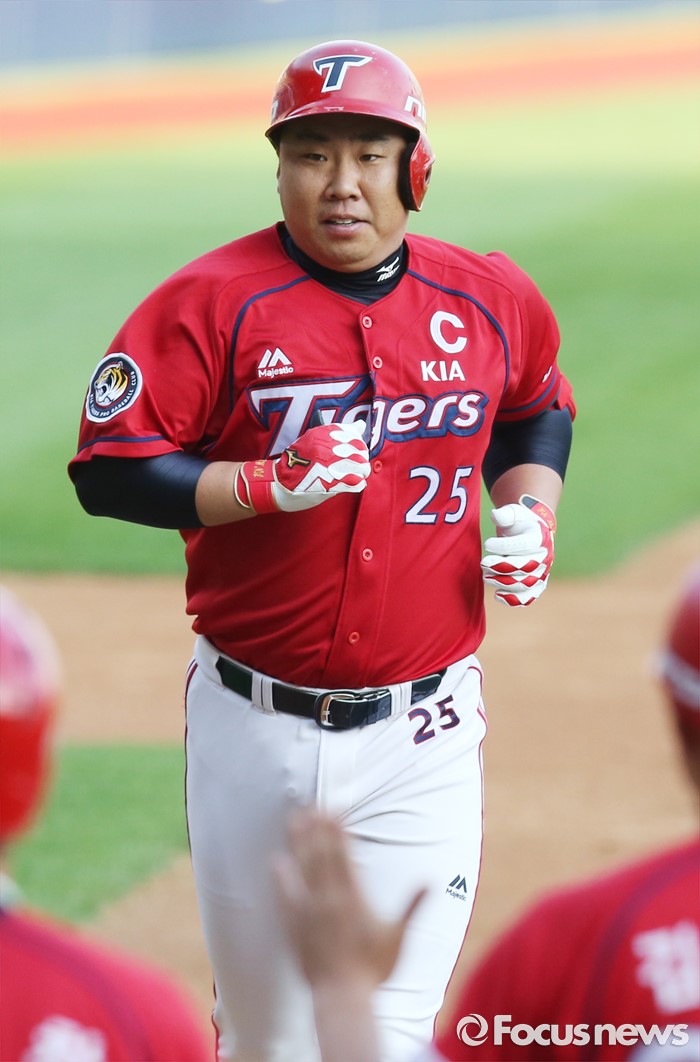 (서울=포커스뉴스) 8일 서울 잠실구장에서 열린 2016 프로야구 KIA-두산 경기 1회초 2사 1루에서 KIA 이범호가 좌월 2점 홈런을 치고 홈인하고 있다.