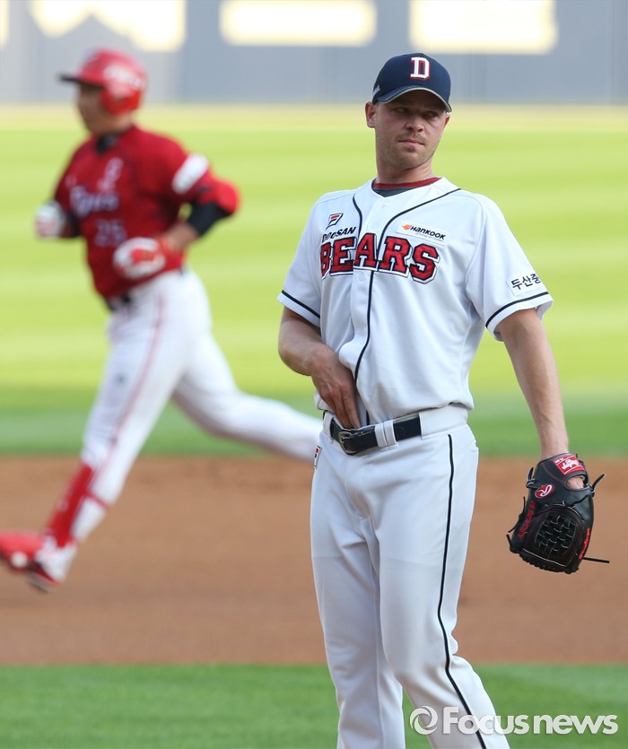 (서울=포커스뉴스) 8일 서울 잠실구장에서 열린 2016 프로야구 KIA-두산 경기 1회초 2사 1루에서 두산 투수 보우덴이 KIA 이범호에게 홈런을 맞고 실망한 표정으로 옷 매무새를 고치고 있다.