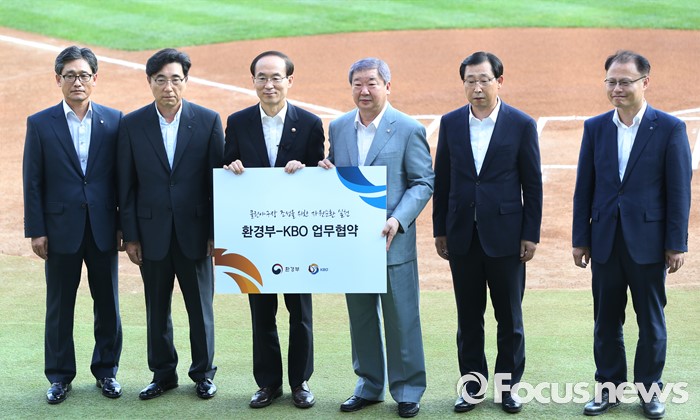 (서울=포커스뉴스) 8일 서울 잠실구장에서 열린 2016 프로야구 KIA-두산 경기에 앞서 환경부-KBO 간 '클린 야구장 조성을 위한 자원순환 실천'을 위한 업무협약식을 갖고 기념사진을 찍고 있다. 왼쪽부터 양해영 KBO 사무총장, 김승영 두산베어스 대표이사, 윤성규 환경부 장관, 구본능 KBO 총재, 박한우 기아타이거스 대표이사, 신진수 환경부 자원순환국장.
