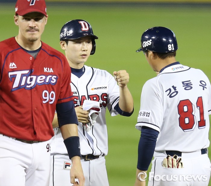 (서울=포커스뉴스) 8일 서울 잠실구장에서 열린 2016 프로야구 KIA-두산 경기 8회말 1사 1,3루에서 두산 김동한이 좌익선상으로 빠지는 2타점 2루타를 치고 강동우 코치의 축하를 받고 있다.