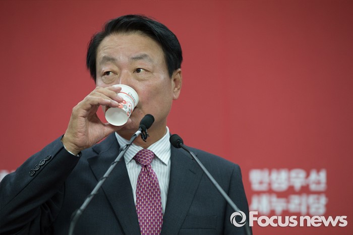 (서울=포커스뉴스) 10일 오후 서울 영등포구 새누리당 당사에서 한선교 새누리당 의원이 당대표 출마 기자회견 중에 물을 마시고 있다.
