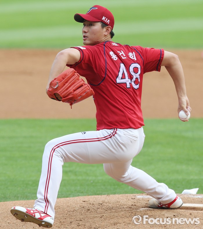 (서울=포커스뉴스) 10일 서울 잠실구장에서 열린 2016 프로야구 KIA-두산 경기에서 1회말 KIA 선발투수 홍건희가 투구하고 있다.
