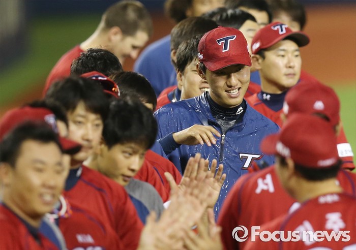 (서울=포커스뉴스) 10일 서울 잠실구장에서 열린 2016 프로야구 KIA-두산 경기에서 선발승을 올린 KIA 투수 홍건희가 기쁜 표정으로 선수들을 맞고 있다.