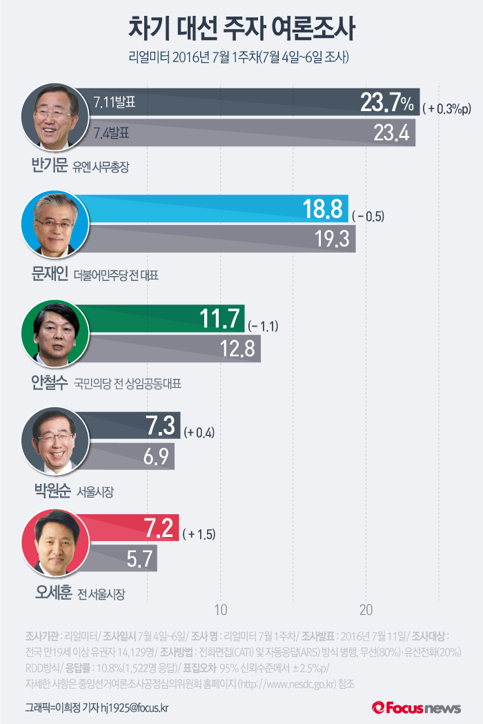 (서울=포커스뉴스) 여론조사 기관 리얼미터의 2016년 7월 1주차 주중집계에 따르면 차기 대선 주자 여론조사에서 반기문 유엔사무총장이 완만한 상승세로 선두 자리를 지켰다. 문재인 더불어민주당 전 대표와 안철수 국민의당 전 상임공동대표의 지지율은 하락한 것으로 조사됐다.