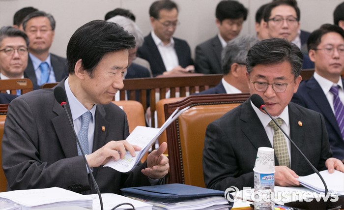(서울=포커스뉴스) 11일 오전 서울 여의도 국회에서 열린 외교통일위원회 전체회의에 참석한 윤병세(왼쪽) 외교부 장관과 홍용표 통일부 장관이 대화하고 있다.