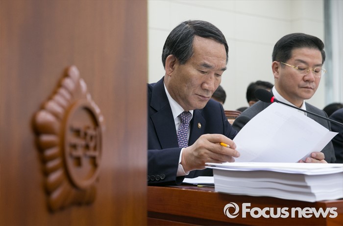 (서울=포커스뉴스) 11일 오전 서울 여의도 국회에서 열린 정무위원회 전체회의에 참석한 박승춘(왼쪽) 국가보훈처장과 성영훈 국민권익위원장이 자료를 살펴보고 있다.