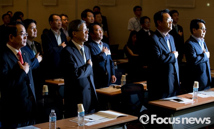 (서울=포커스뉴스) 11일 오후 서울 여의도 중소기업중앙회관에서 열린 새누리당 전국원외위원장협의회 전체회의에 참석한 심재철(앞줄 오른쪽부터) 국회 부의장, 정진석 원내대표, 김희옥 혁신비대위원장, 박명재 사무총장 등이 국기에 대한 경례를 하고 있다.
