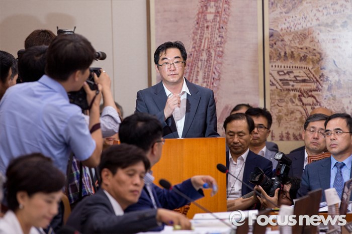 (서울=포커스뉴스) 민중을 개, 돼지로 표현한 발언으로 비판을 받고 있는 나향욱 교육부 정책기획관이 11일 오후 서울 여의도 국회에서 열린 교육문화체육관광위원회 전체회의에 참석해 교문위원들의 질의를 받고 있다.