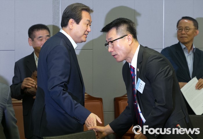 (서울=포커스뉴스) 12일 오전 서울 여의도 국회 의원회관에서 국가전략포럼 주최로 열린 국민이 바라는 개헌, 어떻게 할 것인가? 세미나에 참석한 김무성 새누리당 전 대표가 참석자들과 인사하고 있다.