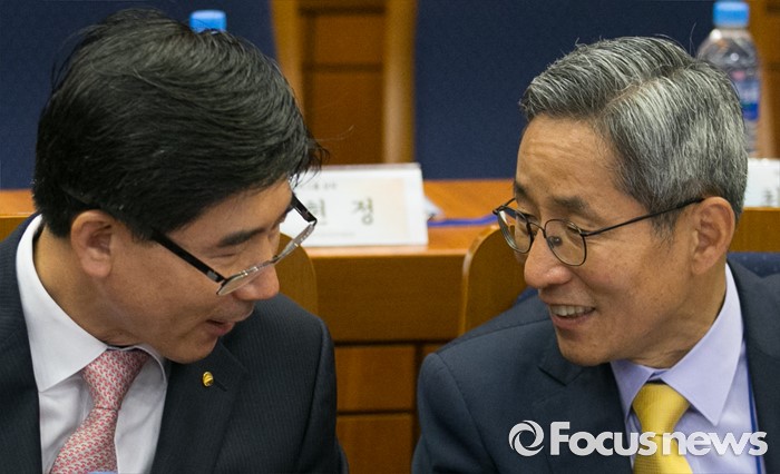 (서울=포커스뉴스) 12일 오전 서울 여의도 국회 헌정기념관에서 열린 글로벌금융학회 정책심포지엄에 참석한 윤종규(오른쪽) KB금융그룹 회장, 이광구 우리은행장이 대화하고 있다.