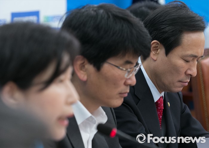 (서울=포커스뉴스) 12일 오전 서울 여의도 국회에서 열린 더불어민주당 원내대책회의에 참석한 우상호(오른쪽) 원내대표가 의원들 발언을 들으며 생각에 잠겨 있다.