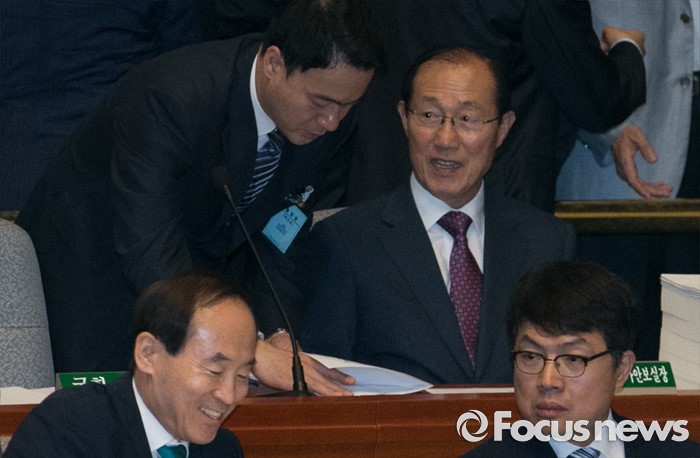 (서울=포커스뉴스) 12일 오전 서울 여의도 국회에서 2015회계연도 결산을 위해 열린 예산결산특별위원회 전체회의에 참석한 이원종(오른쪽) 대통령비서실장이 관계자와 대화하고 있다.