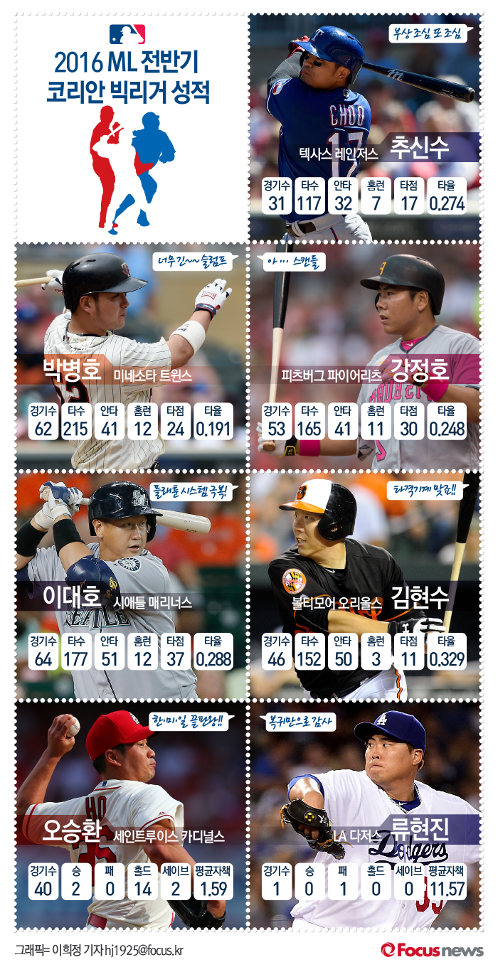 추신수(텍사스 레인저스)를 비롯해 강정호(피츠버그 파이어리츠) 이대호(시애틀 매리너스) 김현수(볼티모어 오리올스) 박병호(미네소타 트윈스) 최지만(LA에인절스) 오승환(세인트루이스 카디널스) 류현진(LA다저스) 등 코리안 메이저리거들은 올스타전 휴식기 몸상태를 추스린 뒤 후반기 다시 질주를 예고하고 있다.