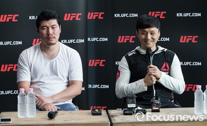(서울=포커스뉴스) 지난 9일 티아고 타바레스(31, 브라질)를 1라운드 2분 42초에 TKO로 제압하고, UFC 3연속 KO 승리라는 쾌거를 이루고 귀국한 ‘코리안 슈퍼보이’ 최두호가 선수가 12일 오전 서울 여의도 리복 센티널 IFC에서 감독과 함께 기자회견을 하고 있다.