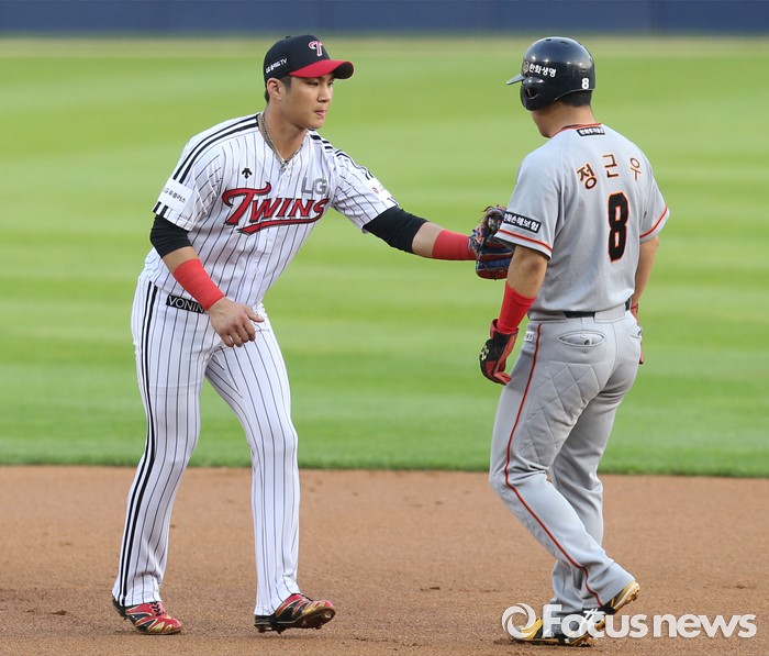 (서울=포커스뉴스) 12일 서울 잠실구장에서 열린 2016 프로야구 한화-LG 경기 1회초 무사 1루에서 한화 이용규의 1루땅볼때 1루주자 정근우가 2루에서 태그아웃되고 있다.