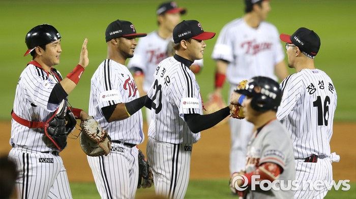 △ 하이파이브하며 기뻐하는 LG 선수들