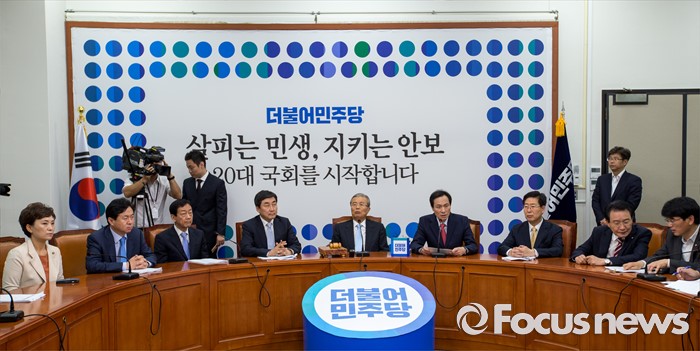(서울=포커스뉴스) 우상호(오른쪽 네 번째) 더불어민주당 원내대표가 13일 오전 서울 여의도 국회에서 열린 비상대책위원회의에 참석해 모두발언 하고 있다.