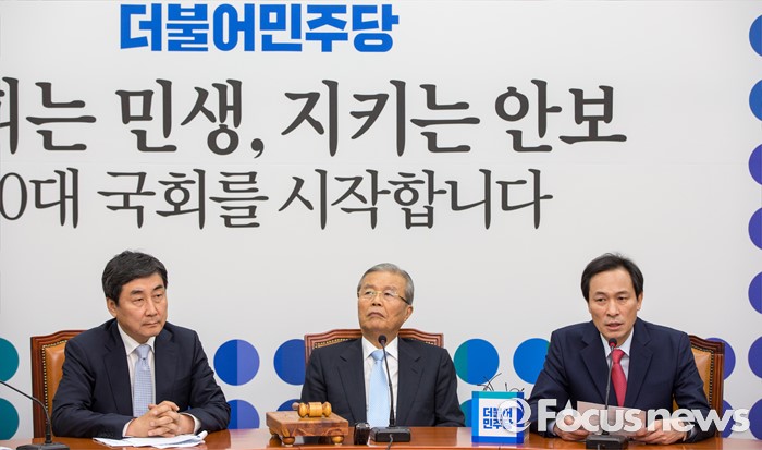 (서울=포커스뉴스) 우상호(오른쪽) 더불어민주당 원내대표가 13일 오전 서울 여의도 국회에서 열린 비상대책위원회의에 참석해 모두발언 하고 있다.