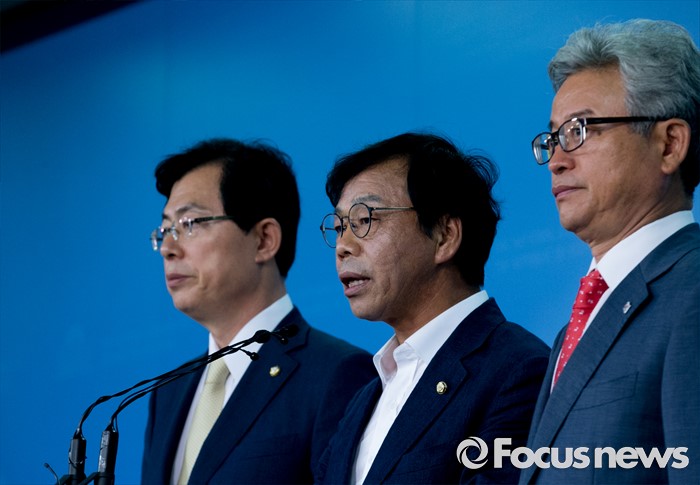 (서울=포커스뉴스) 13일 오전 서울 여의도 국회 정론관에서 이완영(경북 고령·성주·칠곡, 가운데) 새누리당 의원과 이만희(왼쪽), 이철우 의원이 사드 대구 및 경북지역 사드배치와 관련 항의 기자회견을 하고 있다.