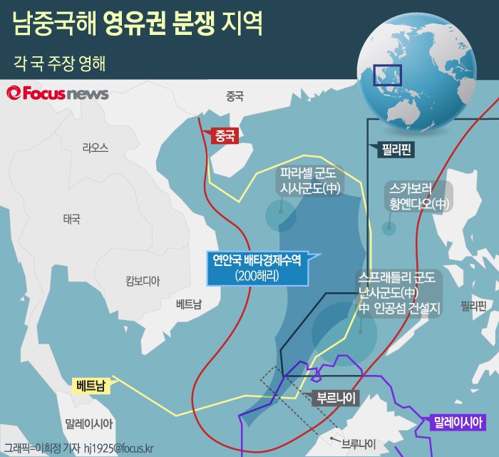 앞서 네덜란드 헤이그 소재의 PCA는 11일 '중국이 남중국해 해역에 대해 역사적인 권리를 주장하는 것에는 어떠한 법적인 근거도 없다'며 영유권 분쟁에 대해 필리핀 승소 판결을 내렸다. PCA 판결은 법적 구속력은 있지만, 강제력은 없다.(서울=포커스뉴스) 남중국해 부근은 중국과 베트남, 필리핀, 말레이시아 등이 서로 영유권을 주장하고 있는 분쟁지역이다. 2016.01.04 이희정 기자