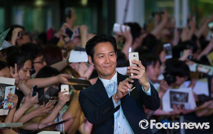 (서울=포커스뉴스) 13일 오후 서울 영등포구 타임스퀘어에서 열린 영화 '인천상륙작전' 레드카펫 행사에 참석한 배우 이정재가 팬들과 사진 찍고 있다.
