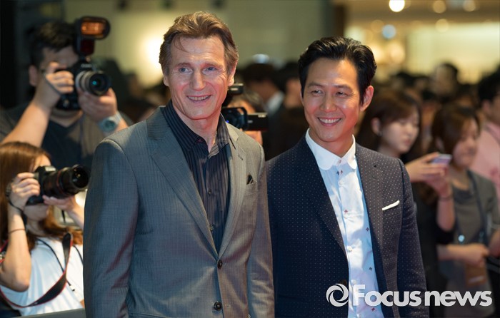 (서울=포커스뉴스) 13일 오후 서울 영등포구 타임스퀘어에서 열린 영화 '인천상륙작전' 레드카펫 행사에 참석한 배우 리암 니슨(왼쪽)과 이정재가 미소 짓고 있다.