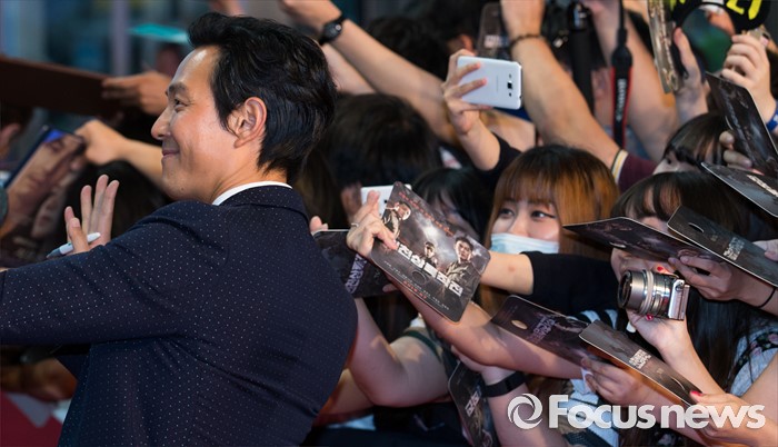 (서울=포커스뉴스) 13일 오후 서울 영등포구 타임스퀘어에서 열린 영화 '인천상륙작전' 레드카펫 행사에 참석한 배우 이정재가 팬들과 사진 찍고 있다.