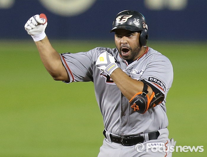 | △ 재역전타 치고 환호하는 한화 로사리오 |