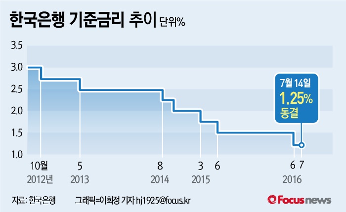 역대 최저 금리에 사상 최대치로 불어난 가계부채와 시중통화량은 한은의 책임이 크다는 것은 부인할 수 없다. 다만 바통을 이어받아 돈의 물꼬를 터줘야 할 정부가 이렇다할 대책을 내놓지 못하면서 돈이 한쪽으로만 흘러 들어가는 역효과를 낳고 있다는 분석이 뒤따른다.(서울=포커스뉴스) 14일 한국은행은 금융통화위원회 정례회의를 열고 7월 기준금리를 기존 1.25% 동결했다.2016.07.14 이희정 기자