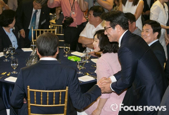 (서울=포커스뉴스) 14일 오후 서울 영등포구 그랜드컨벤션센터에서 열린 당대표 취임 2주년 행사에 참석한 김무성(왼쪽) 새누리당 전 대표가 전당대회 출마를 선언한 정병국 의원과 인사하고 있다.