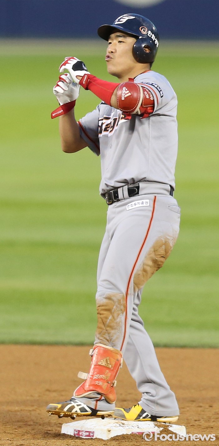(서울=포커스뉴스) 14일 서울 잠실구장에서 열린 2016 프로야구 한화-LG 경기 4회초 무사 3루에서 한화 정근우가 좌익선상으로 빠지는 2루타를 치고 베이스 위에서 환호하고 있다.
