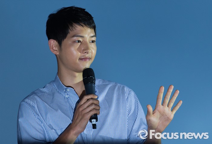 (서울=포커스뉴스) 14일 오후 서울 서대문구 신촌 일대에서 열린'제2회 신촌맥주축제'에 참석한 배우 송중기가 팬들에게 인사하고 있다.
