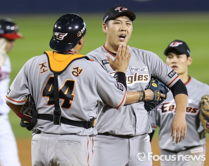 (서울=포커스뉴스) 14일 서울 잠실구장에서 열린 2016 프로야구 한화-LG 경기에서 LG에 승리하며 순위 바꿈을 해 7위로 올라선 한화 포수 조인성과 투수 권혁이 하이파이브하고 있다.