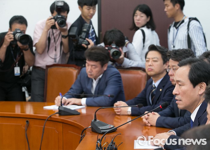 (서울=포커스뉴스) 15일 오전 서울 여의도 국회에서 열린 더불어민주당 사드대책위원회의에 참석한 우상호 원내대표가 모두발언을 하고 있다.