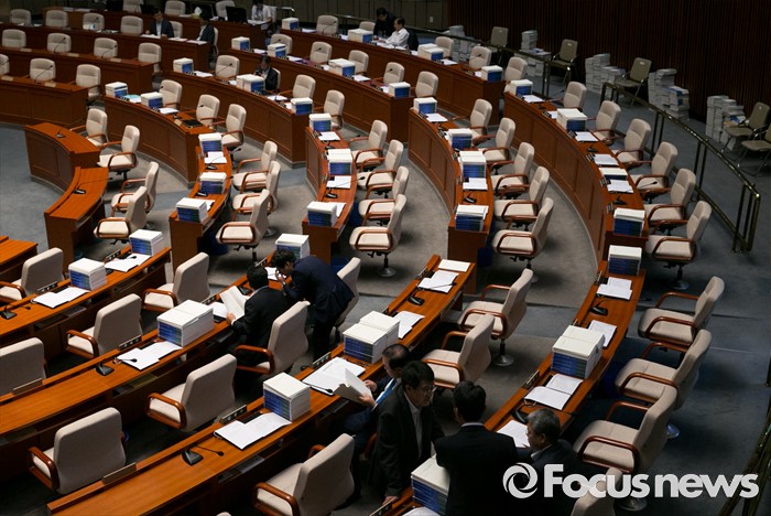 (서울=포커스뉴스) 15일 오전 서울 여의도 국회에서 예정된 예산결산특별위원회 전체회의에 새누리당 의원들이 불참해 빈 자리가 보이고 있다. 이날 새누리당은 더불어민주당 소속 홍영표 국회 환경노동위원장이 야당 단독으로 예비비 지출안 등을 처리한 것과 관련해 홍 위원장의 사퇴를 요구하며 모든 상임위 보이콧을 선언했다.