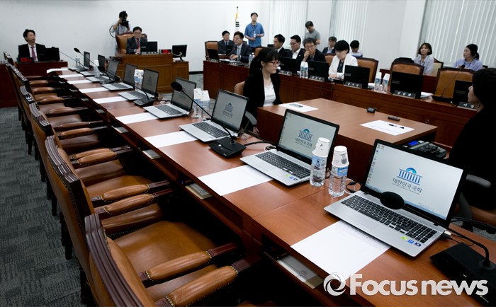 (서울=포커스뉴스) 15일 오전 서울 여의도 국회에서 예정된 가습기살균제 사고 진상규명과 피해구제 및 재발방지 대책 마련을 위한 국정조사특별위원회 전체회의에 참석한 야당 의원들이 새누리당 의원들을 기다리며 회의 진행을 하고 있다. 이날 새누리당은 더불어민주당 소속 홍영표 국회 환경노동위원장이 야당 단독으로 예비비 지출안 등을 처리한 것과 관련해 홍 위원장의 사퇴를 요구하며 모든 상임위 보이콧을 선언했다.