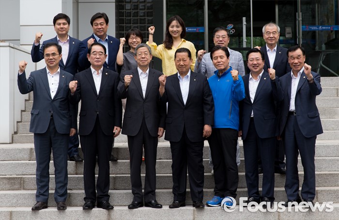 (서울=포커스뉴스) 15일 오전 서울 노원구 태릉선수촌에서 리우올림픽에 출전하는 선수들을 격려하기 위해 방문한 김희옥(왼쪽 세번째부터) 새누리당 혁신비상대책위원장이 김정행 대한체육회장, 최종삼 태릉선수촌장을 비롯한 관계자들과 기념촬영을 하고 있다.